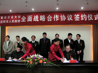 2007年11月9日上午,校党委书记刘强、周清明校长、符少辉副校长率领我校校办、科技处、研究生处、食品科技学院、园艺园林学院、农学院有关负责人,参加了与益阳市政府签订全面战略合作协议签约仪式。