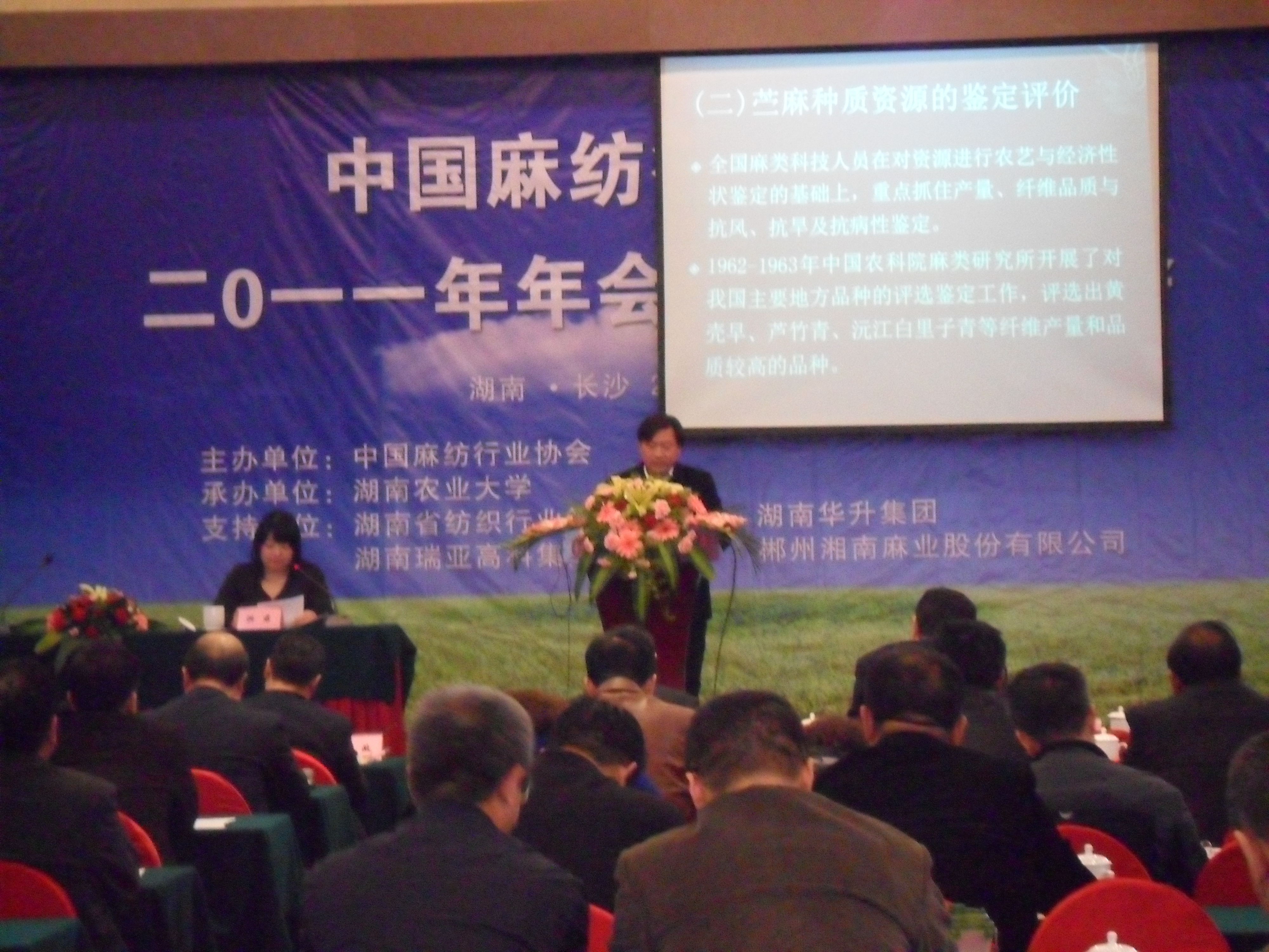 3月16日上午,由中国麻纺行业协会主办、湖南农业大学承办的中国麻纺行业协会2011年年会在紫东阁华天大酒店胜利召开,中国纺织工业协会副会长(原纺织工业部副部长)许坤元,校党委书记刘强,湖南省纺织行业管理办公室主任刘辉,中国麻纺行业协会会长许吉祥,湖南省农业厅副厅长兰定国,湖南省科技厅副巡视员周祖文,湖南省科技厅农村处调研员蒋永成,湖南省农业厅经作处副处长吴若云,中国民生银行北京平安里支行行长唐铁宝出席会议,中国麻纺行业协会会员单位、部分省市行业协会和有关高等院校、科研院所的领导和专家共200多人参加会议。