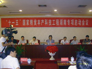 2007年7月4日,由我校主持的国家粮食丰产科技工程湖南专项“长江中游南部(湖南)双季稻丰产高效技术集成研究与示范”启动会议在湖南宾馆顺利召开。湖南省人民政府甘霖副省长,“杂交水稻之父”袁隆平院士,湖南省科技厅王柯敏厅长、刘小明副厅长,省农业综合开发办罗志宏主任,省农业厅雷秉乾总农艺师,省粮食局皮祖玉副局长,我校周清明校长,项目首席专家青先国研究员、长沙市政府曾慧明副秘书长、益阳市政府肖彬副市长、衡阳市政府陈新文副市长出席了会议,参加会议的还有省科技厅、省财政厅、省农业厅和省粮食局、湖南省农科院有关处室的负责同志、课题组主要研究人员和相关核心试验区、技术示范区所在地市科技局、农业局负责同志,共计90余人。浏阳市、耒阳市、赫山区3个核心试验区及汉寿县、安乡县、华容县、湘乡市、醴陵市、冷水滩区6个技术示范区所在县(市、区)政府主管领导还向省粮食丰产科技工程协调领导小组递交了课题执行责任书。